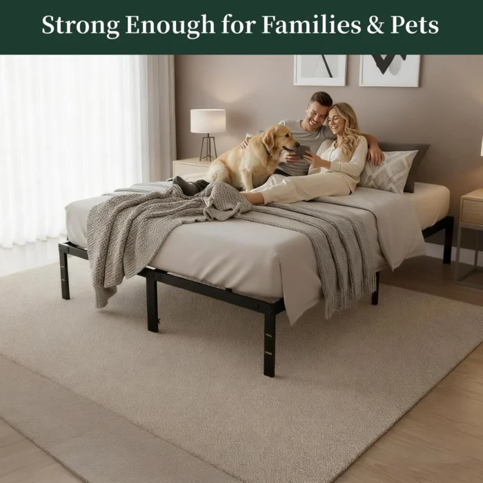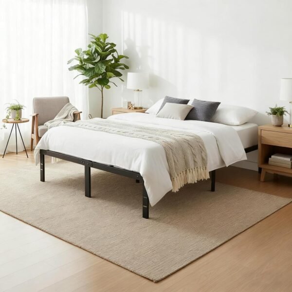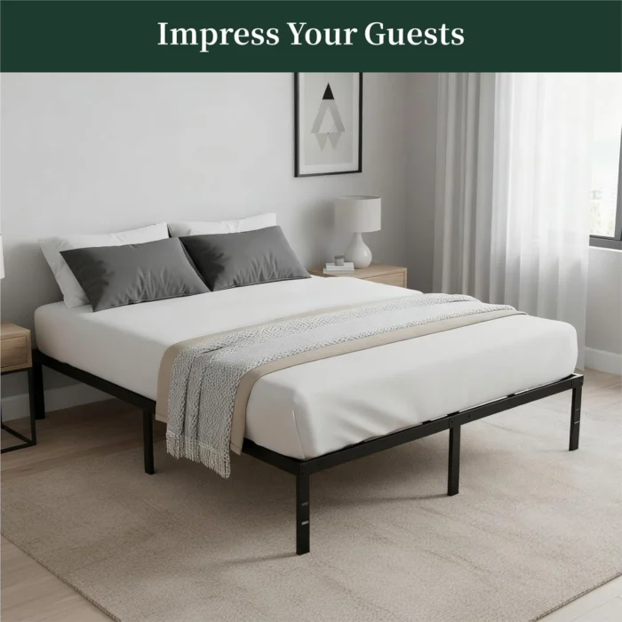 #$% Transform your bedroom into a stylish and organized retreat with the SageNest bed frame. Featuring a sleek, minimalist design, this metal platform bed adds modern charm while creating a stable foundation for restful sleep. The 14-inch height provides ample underbed storage, perfect for keeping blankets, clothes, or shoes neatly tucked away. Easy to assemble and noise-free, it’s ideal for apartments, guest rooms, or everyday use. With no box spring required, this durable bed frame offers both convenience and comfort, making it a smart upgrade for any home. SUPER LOAD-BEARING CAPACITY: Built with heavy duty steel, this queen bed frame supports up to 2200 lbs without a box spring, giving you a safe and stable sleep every night. Perfect for primary bedrooms, guest rooms, or rental spaces. STURDY METAL CONSTRUCTION: Designed with reinforced slats, this platform bed frame provides reliable mattress support while ensuring proper ventilation for latex, memory foam, or spring mattresses. MAXIMIZE UNDERBED STORAGE: With a 14-inch tall design, this metal bed frame offers 12 inches of clearance for storing extra bedding, clothes, shoes, or storage boxes, keeping your room neat and organized. EASY ASSEMBLY: All tools and instructions are included, allowing you to set up this mattress foundation in minutes—compatible with most standard queen size mattresses for long-term, hassle-free use. VERSATILE FOR ANY ROOM: This bed frame with storage is noise-free and durable, making it an excellent choice for bedrooms, dorms, guest rooms, or rental properties, offering comfort and practicality for all occasions. %$#