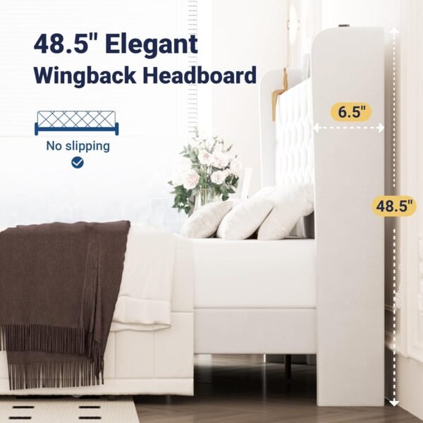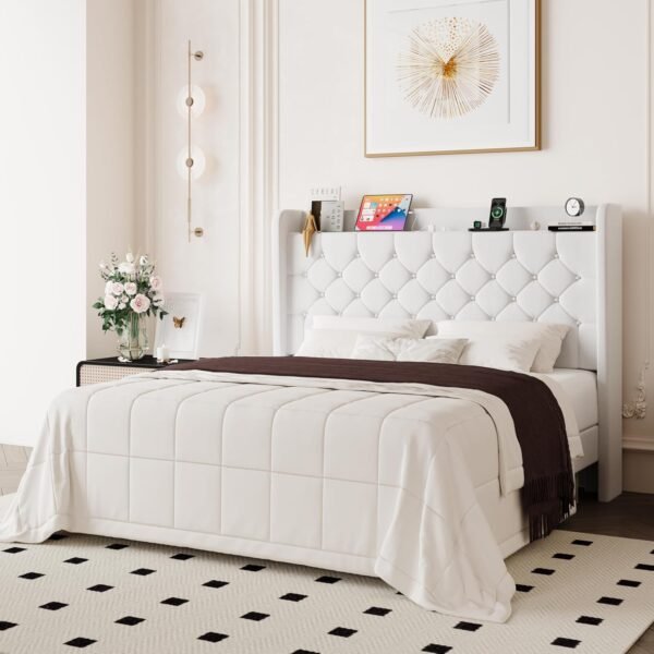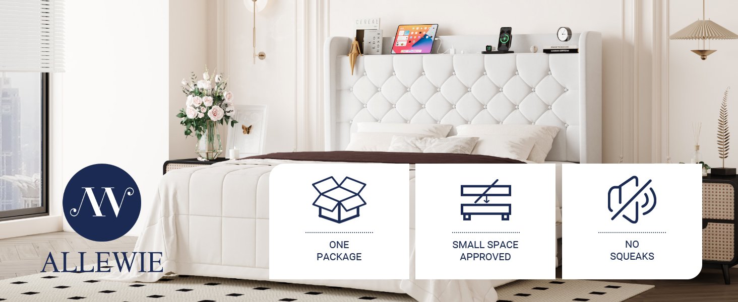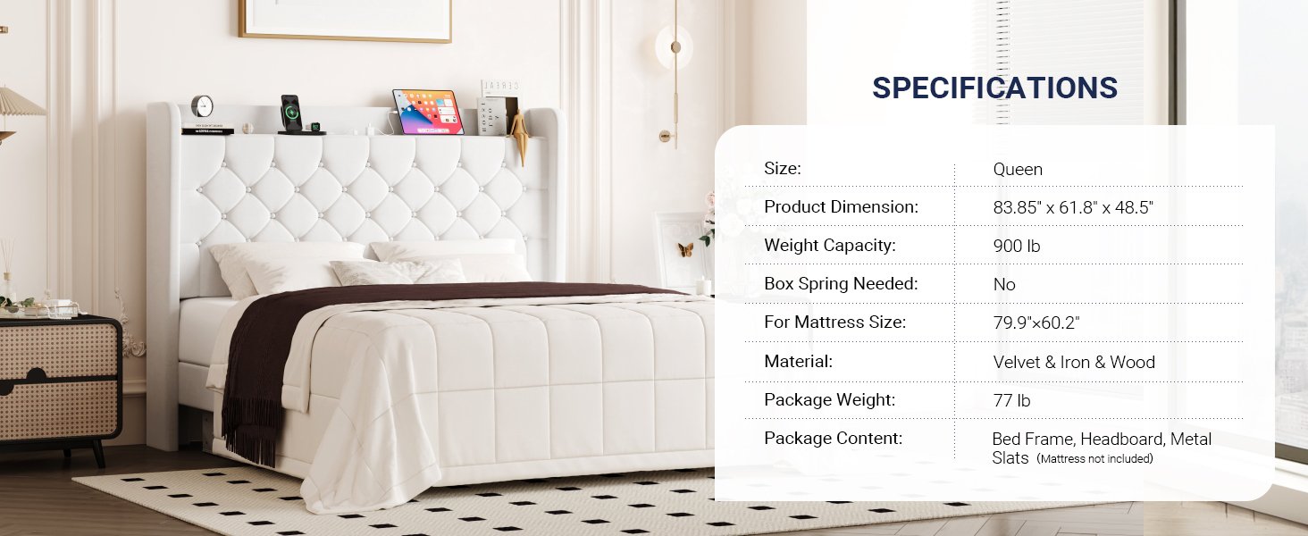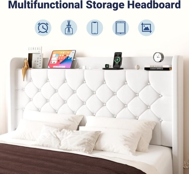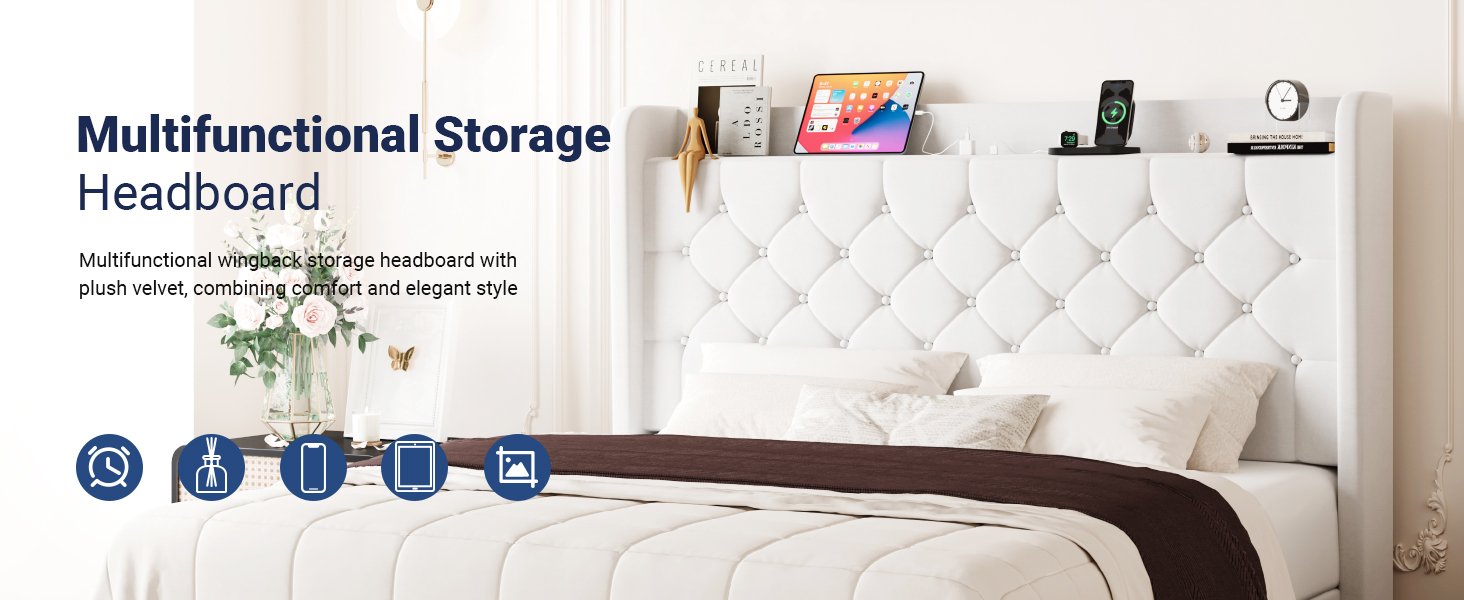 Allewie Queen Size Bed Frame, Storage Headboard with Charging Station, Wingback Velvet Upholstered, Diamond Stitched Button Tufted, Sturdy Wooden Slats, No Box Spring Needed, Easy Assembly, White