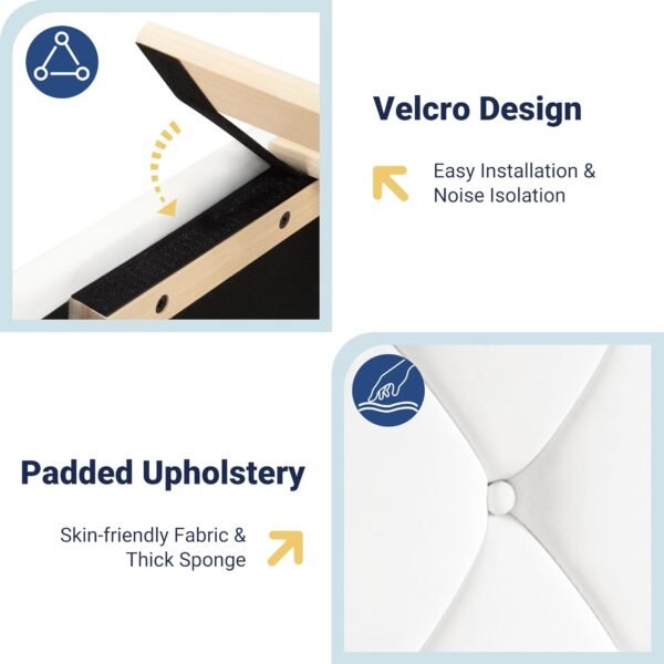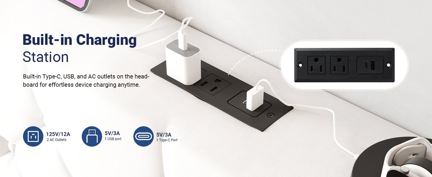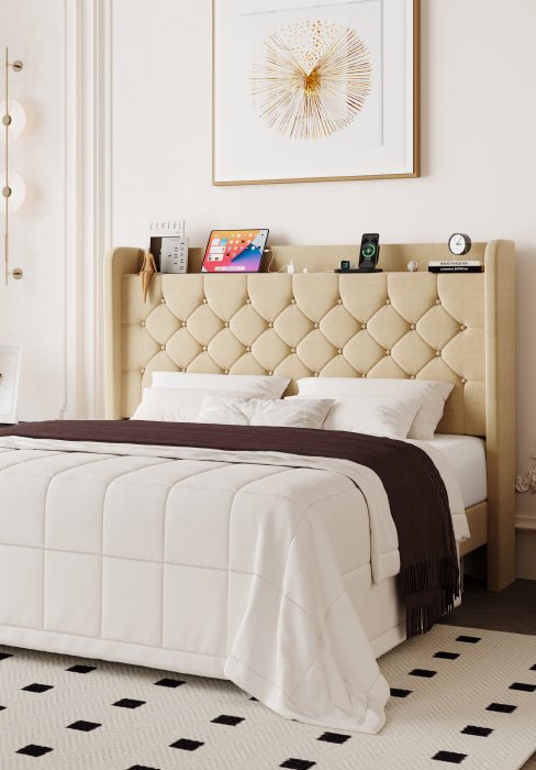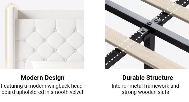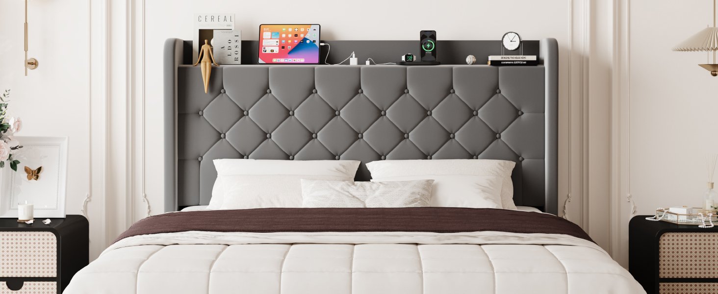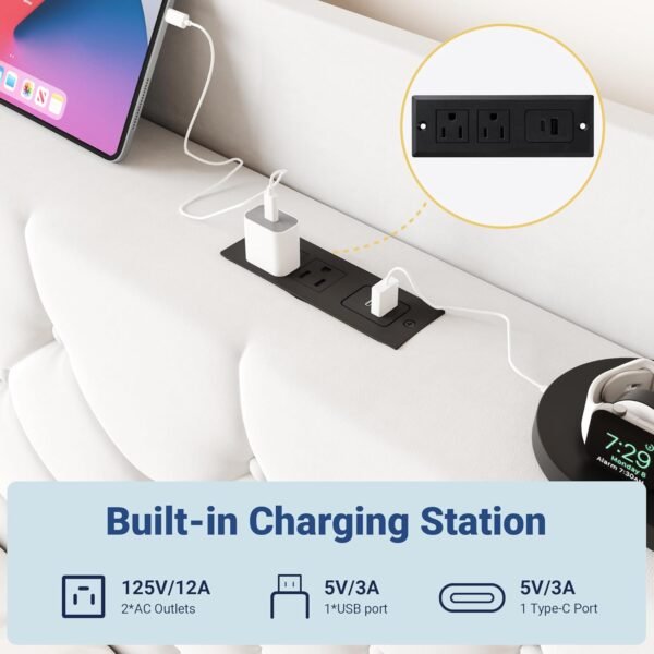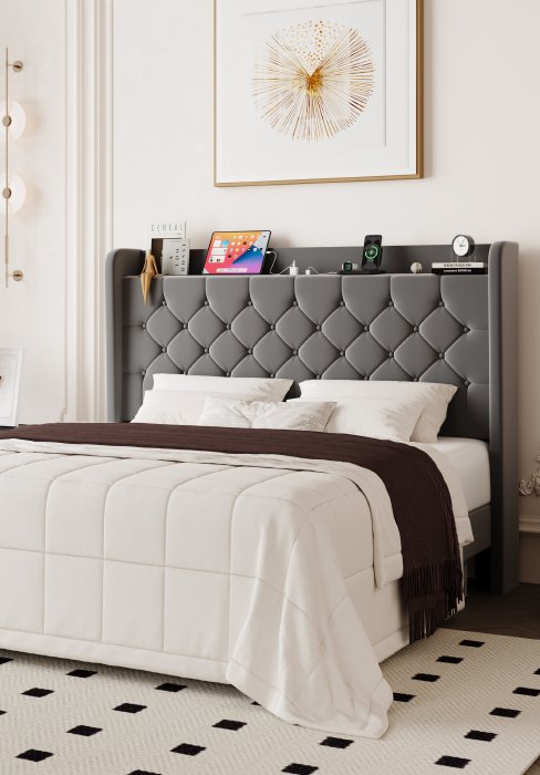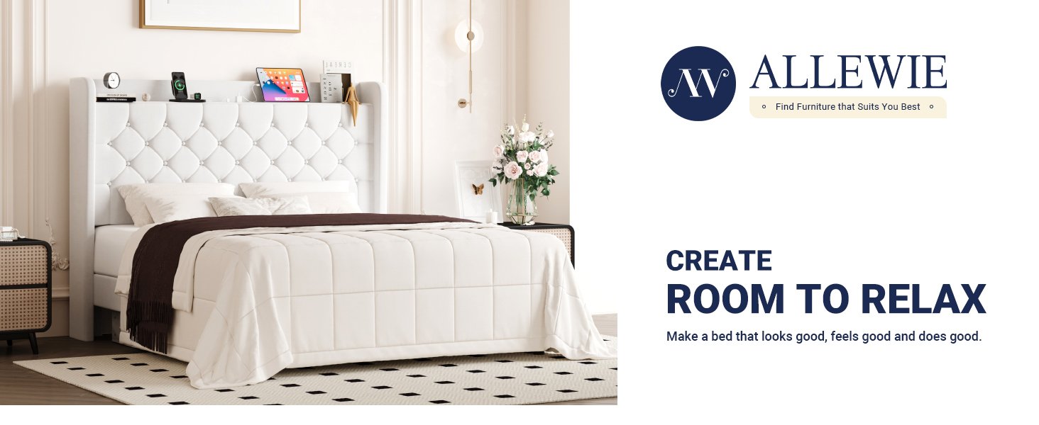 Allewie Queen Size Bed Frame, Storage Headboard with Charging Station, Wingback Velvet Upholstered, Diamond Stitched Button Tufted, Sturdy Wooden Slats, No Box Spring Needed, Easy Assembly, White