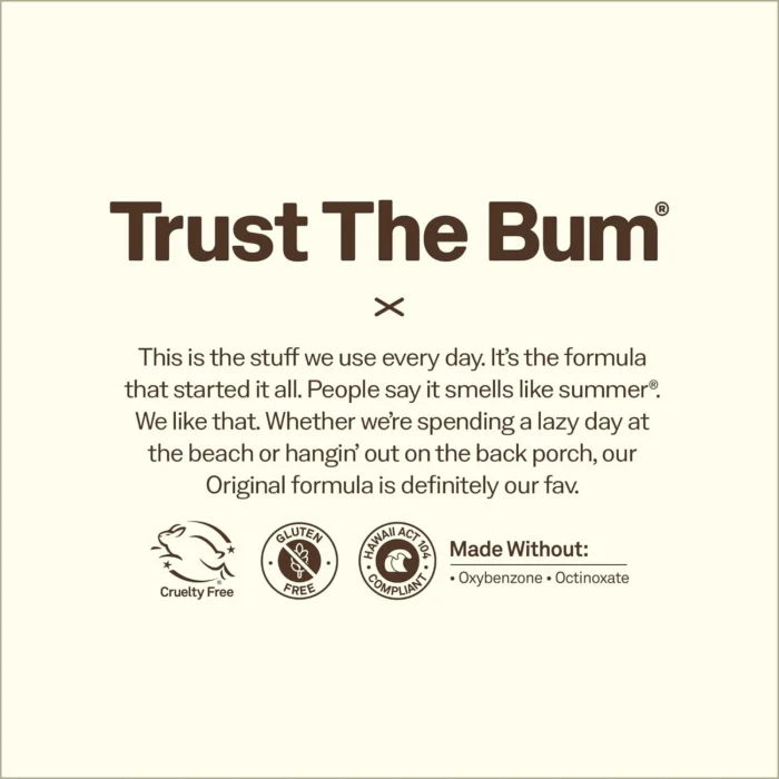 #$% TRUST THE BUM. What does that mean? It means trust us, the ones who live on the beach and need products that work on the most intense days in the sun. The simple truth is, when you make products to protect the ones you love, you make ‘em better.