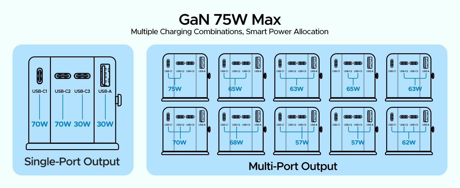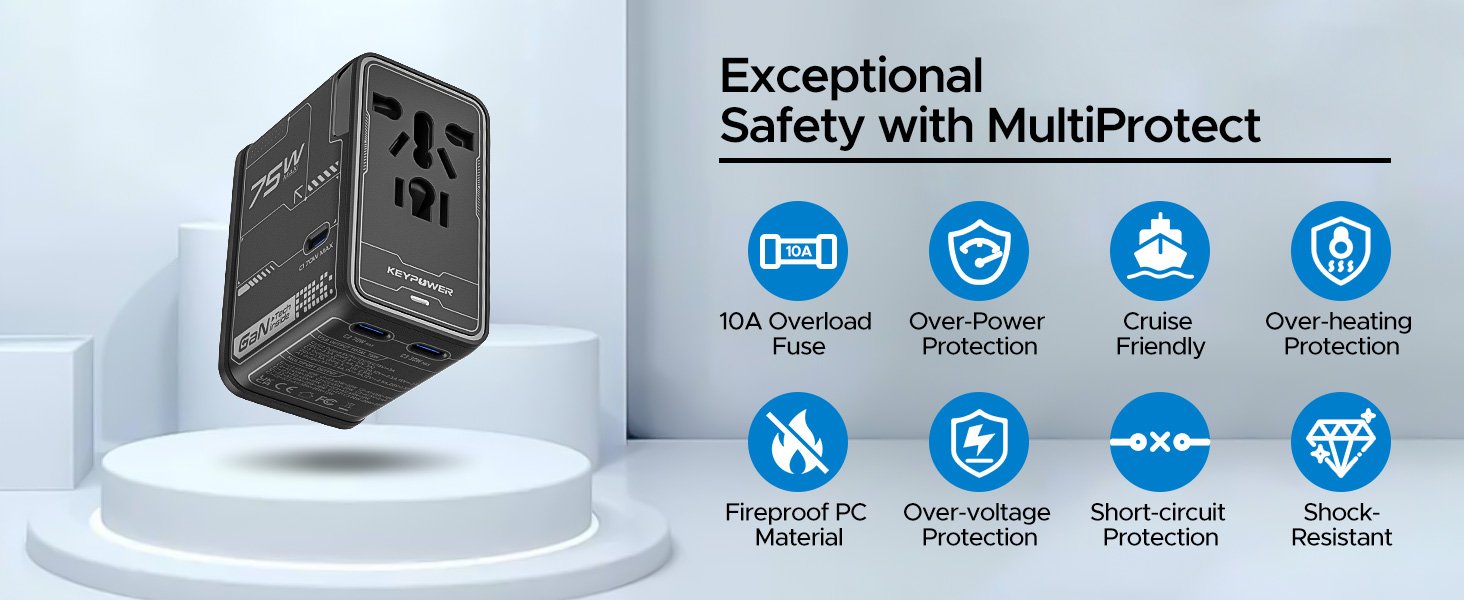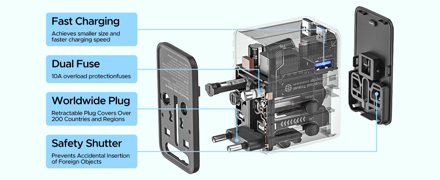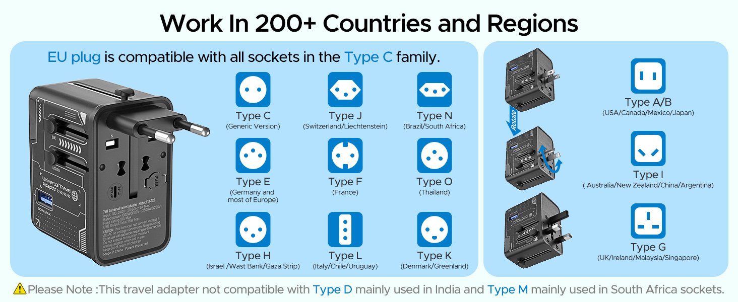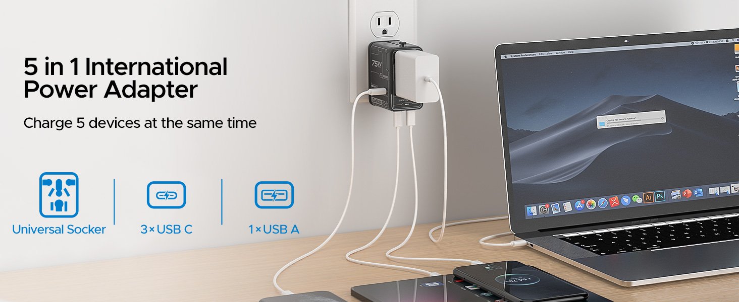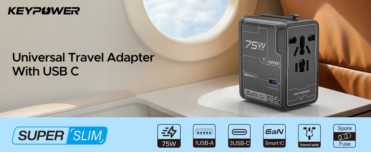 Universal Travel Adapter, 75W GaN International Power Adapter with 3 USB C and 1 USB A, All in One Travel Plug Adapter, Worldwide Outlet Wall Charger Converter for EU US UK AU 200+ Countries.