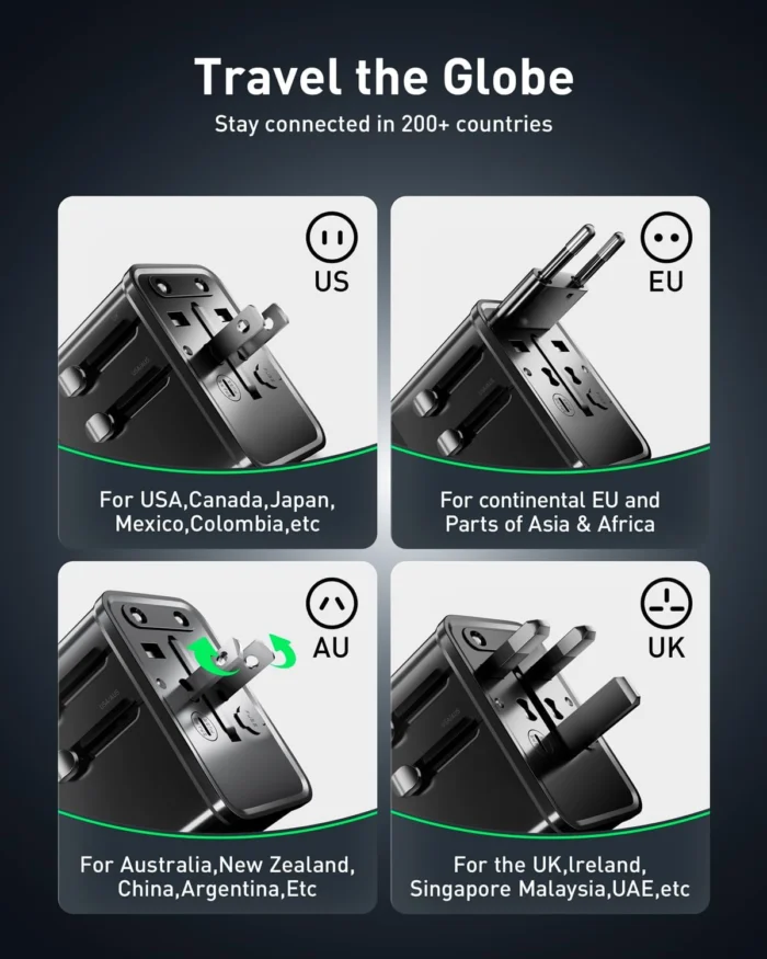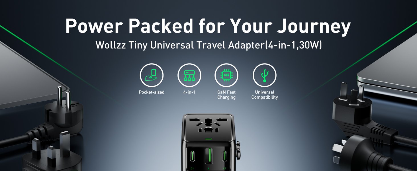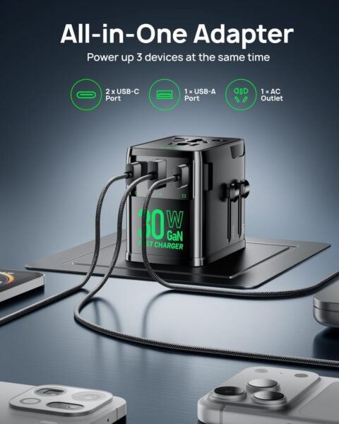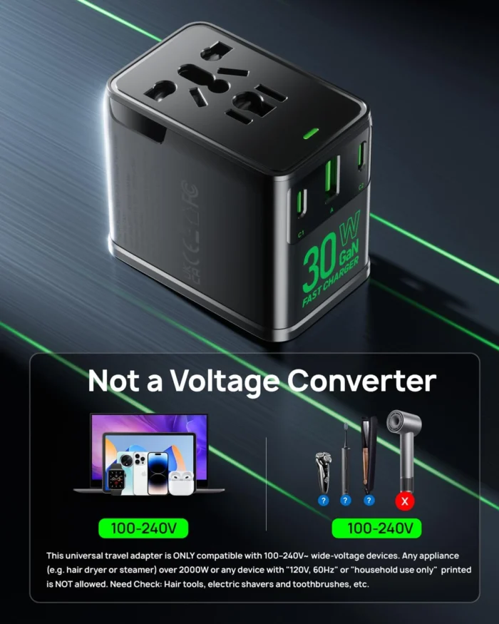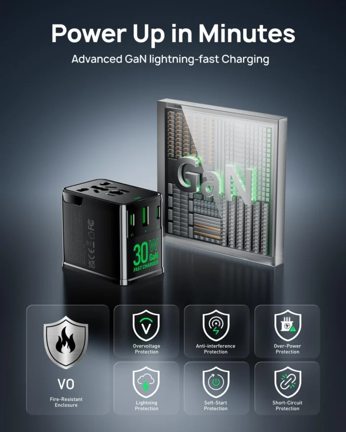 Universal Travel Adapter, 30W GaN Fast Charging International Power Adapter Worldwide Charger with 4 Ports 1 AC, 1 USB-A, and 2 USB-C Ports Plug Adapter for USA European UK AUS Japan