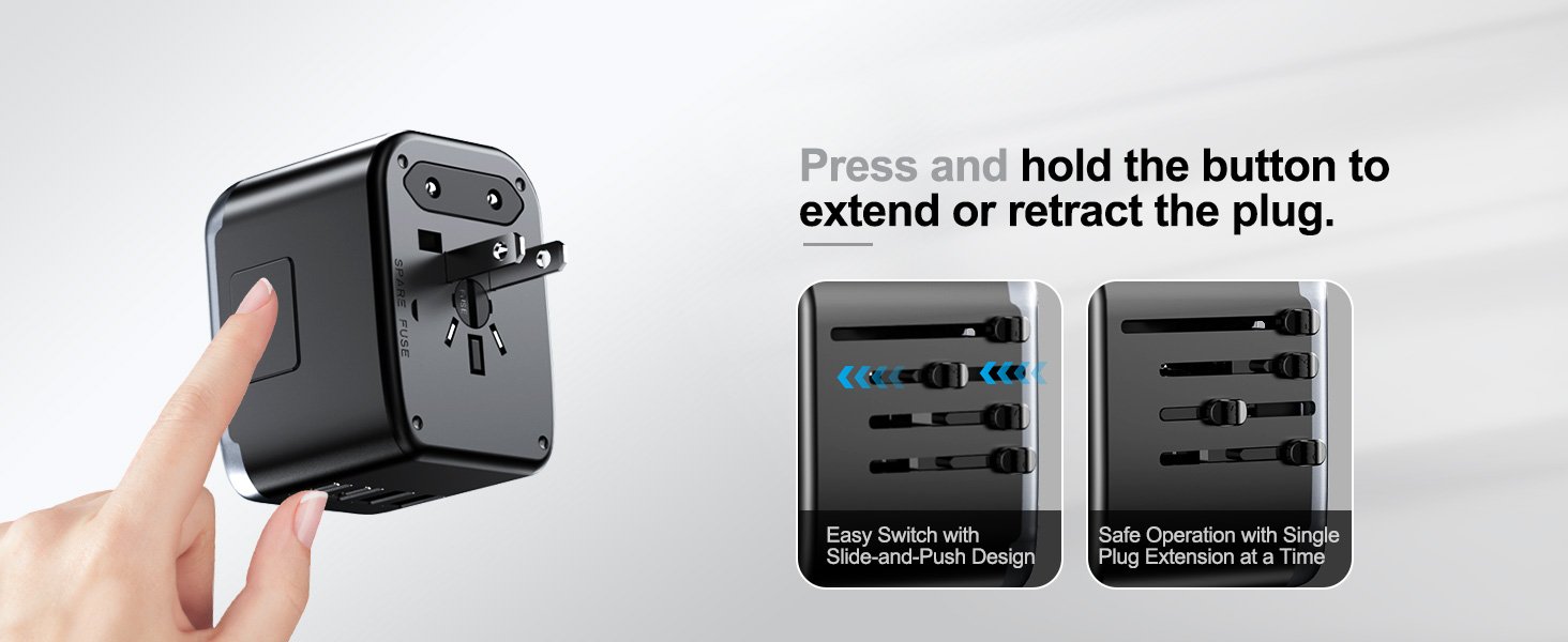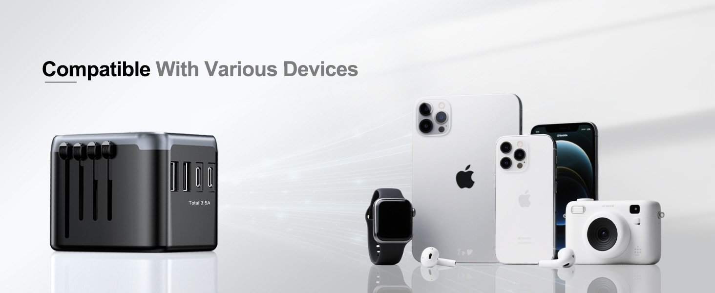 5 in 1 Travel Adapter Worldwide: Charge up to 5 devices simultaneously at high speed with 2 USB-A ports (2.4A), 2 USB-C port (3A), and 1 AC socket.The travel adapters with smart chip can automatically charge most of devices, compatible for iPad, iPhone, Android, digital camera, MP3, etc. NOT for high-power appliances such as conair hair dryers, hair straightener