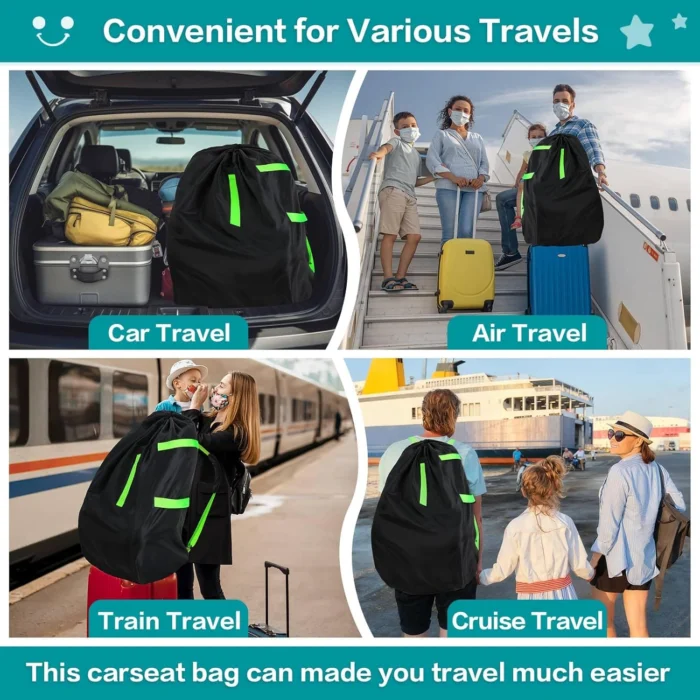 Reviewer: Megan Rating: 5.0 out of 5 stars Title: Extra large & easy to carry carseat / stroller bag for airport Review: This bag is made of a thin, easy to fold fabric which makes it great for storing when not in use while still being durable on the go.I was looking for an extra large storage bag that was able to fit the car seat AND an airport dolly, which this is perfect for. The combined weight of both of my items in the bag was 13lbs, which I had no issues carrying with the thinner straps. The straps are also surprisingly comfortable. This is a great budget option. Reviewer: Isa Cherry Rating: 5.0 out of 5 stars Title: travel essentials Review: Perfect bag for the carseat when trying via plane. Keeps everything well protected and clearly marked with the tags. lightweight and durable. Fits everything in the bag & shoulder strap is thick. Reviewer: Andrea Rating: 4.0 out of 5 stars Title: Perfect for the value Review: Perfect for our trip, never ripped and you can fold it back into a little pouch. Shoulder strap wasn’t that comfortable, but for what you paid for, it was exactly what I expected. It store our car seat and even a foldable camping chair (for the baby), so it held pretty good throughout the whole trip and protected both items just fine! Reviewer: Raegan Sliva Rating: 5.0 out of 5 stars Title: Convenient backpack straps & durable!! Review: Durable, great size, super convenient backpack straps!! Reviewer: Literally just a girl Rating: 5.0 out of 5 stars Title: Good but tie the top Review: Worked well but the draw string needs to be tied, the little string tightened did not hold up through people throwing it around Reviewer: Brylee Rating: 3.0 out of 5 stars Title: Good straps. Overall too thin material Review: Durability is a 2.5/5Ease of use 5/5Functionality 5/5Quality 3/5We just used these on a trip x2 and one ripped at the corner of the car seat. Not a huge deal but kinda disappointed it didn’t hold up better. It did hold up well to being carried backpack style as well as like a suitcase. The handles seem to be sturdy/stitched strong enough. The material itself is just a little too thin. Reviewer: Sue Hoskins Rating: 5.0 out of 5 stars Title: Easy to use for airport travel Review: Traveled across the country with my 8 month old and decided we wanted to check his car seat. We checked it with no problems and it’s a great size for bigger car seats as well as infant car seats! Great option at a good price! Reviewer: Jordan louden Rating: 5.0 out of 5 stars Title: Great purchase! Review: This is one of the best traveling bags we got because it also holds more than just a car seat! We put our blankets and kids stuffed animals in it as well and it was great! Carried just like a backpack!