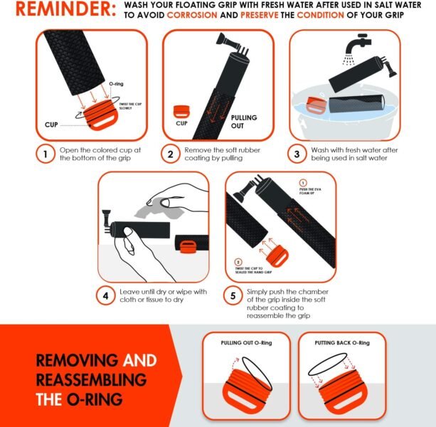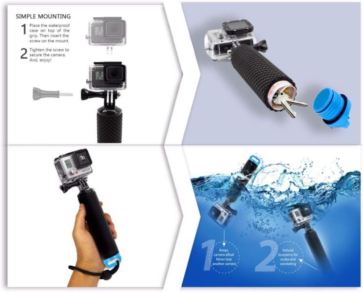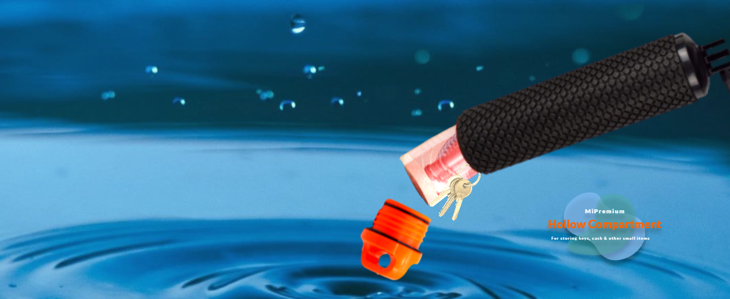 Multi-purpose hollow compartment – keep your essential safe while in water: The watertight compartment of the grip can be used either as a storage for your valuable small items to keep dry; or to achieve neutral buoyancy during scuba diving, snorkelling & other underwater activities. When the handle is filled with water it hovers neutrally underwater without forcing its way up to the surface, while used with no water in the chamber it turn into a camera floater and float on water surface.