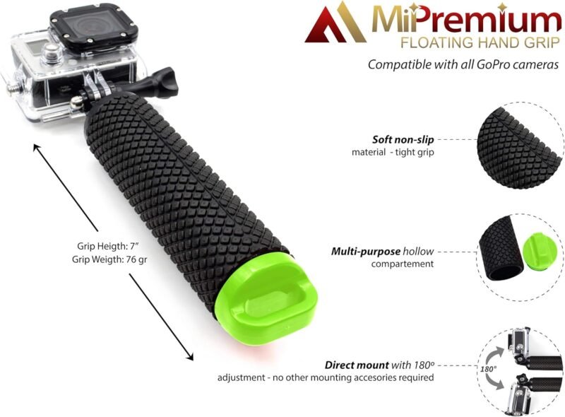 Pocket-size portable and lightweight – The hand grip is 7 inches tall and only weighs under 80 grams and can be used both on land and in the water. This compact and light-weight floating stick is fully compatible with GoPro HD Silver and Black Hero 13 Hero 12 Hero 11 Hero 10, Hero 9, Hero8, Hero 7, Hero 1, Hero 2, Hero 3, Hero 3+, Hero 4, Hero 4s, Hero 6, Hero 5 Session edition. No other mount accessories are required. The mount tilts 180 degree providing increased shooting possibilities.