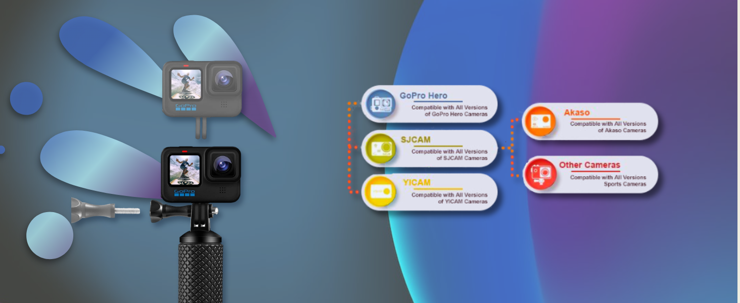 Our floating handler comes with standard built-in mount, allowing you to mount go pro or other action cameras without the need for additional mounting attachment accessories. Though your camera or camera case should have 2 fork mounting attachment.