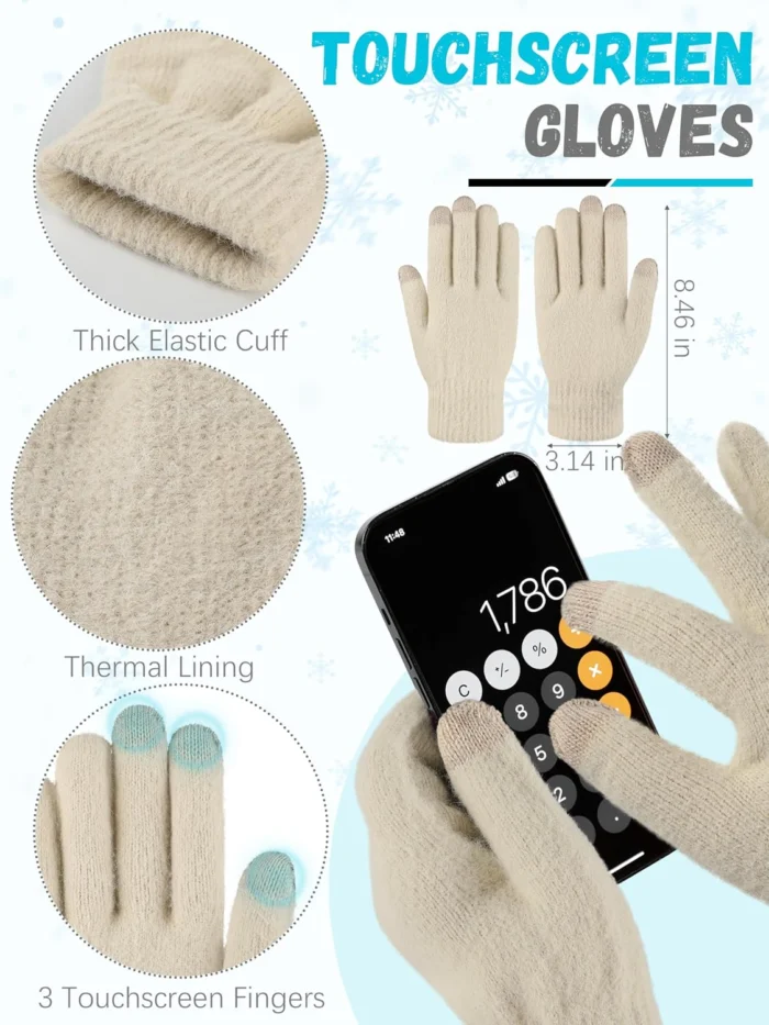 Reviewer: MHarper Rating: 5.0 out of 5 stars Title: Looks great – and better quality than I expected Review: Got this as an Xmas gift for my wife who is always cold. When it arrived I was a little worried that the quality was going to be bad as it was all packed into this kind of trashy cellophane bag. However once my wife opened it she loved it. The scarf is a good length, the hat itself is thicker than I expected and had a good solid ‘knit’ to it. It was so comfortable and warm that she wore it the rest of the evening. I bought the white and it was very vibrant, and looked great. I was worried about picking the white as it tends to get dirty quickly but that is more us not the product. Haven’t had to wash them yet though so not sure how it holds up there. Great price on a great looking (and warm) complete set of cold weather gear. Reviewer: DeeJah W. Rating: 5.0 out of 5 stars Title: Nice and Soft Review: The knit is on the thin side. It is very soft, attractive and warm. Reviewer: Mary Rating: 5.0 out of 5 stars Title: Glad I purchased! Review: Soft and so warm! These really do well at keeping me warm when I spend time in cold temps. I wash them in delicate cycle and let air dry. They still look new. The color choices are amazing! Reviewer: Hushlight Rating: 4.0 out of 5 stars Title: Feels As Soft As It Looks – Nice And Warm Review: Very soft, nice and cozy. Bought for my aunt, but then borrowed the scarf. It provides a lot of warmth but isn’t uncomfortable or heavy. Reviewer: SJ Rating: 5.0 out of 5 stars Title: Real warm without the fuzz Review: The best winter buddies you could ever have and they look good. Reviewer: D Rating: 5.0 out of 5 stars Title: Winter hat scarf gloves set Review: Warm set. Gloves are slightly short in fingers but not a no go. Scarf is good length and fluffy. Hat is a perfect size. Recommend this set. Reviewer: Steven Blanco Rating: 3.0 out of 5 stars Title: Has a chemical smell Review: These have a very chemical smell that just doesn’t go away with washing. Hat is very warm but has an ugly seam across forehead. Gloves are not supper warm if really cold out. Reviewer: Exactly as stated Rating: 5.0 out of 5 stars Title: Great color soft and cute Review: Purchased got my 27 year old daughter. She loved it and wore all 3 pieces. Gloves are good so you can use your cell phone with them on which was much better than her leather gloves. Decent quality very soft. Reviewer: user-MKBB7S Rating: 1.0 out of 5 stars Title: Review: غير مطابقخامات سيئة جدا Reviewer: Nancy gohar Rating: 1.0 out of 5 stars Title: Review: It doesn’t look like the picture.. and also the material so bad