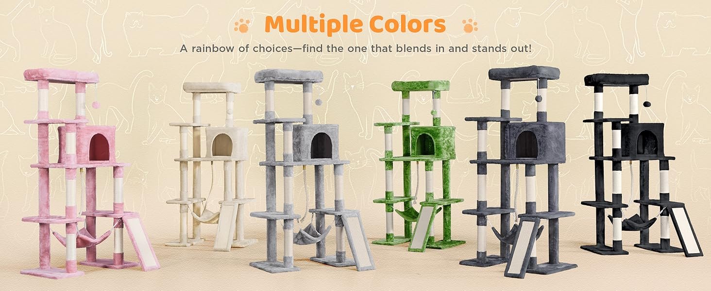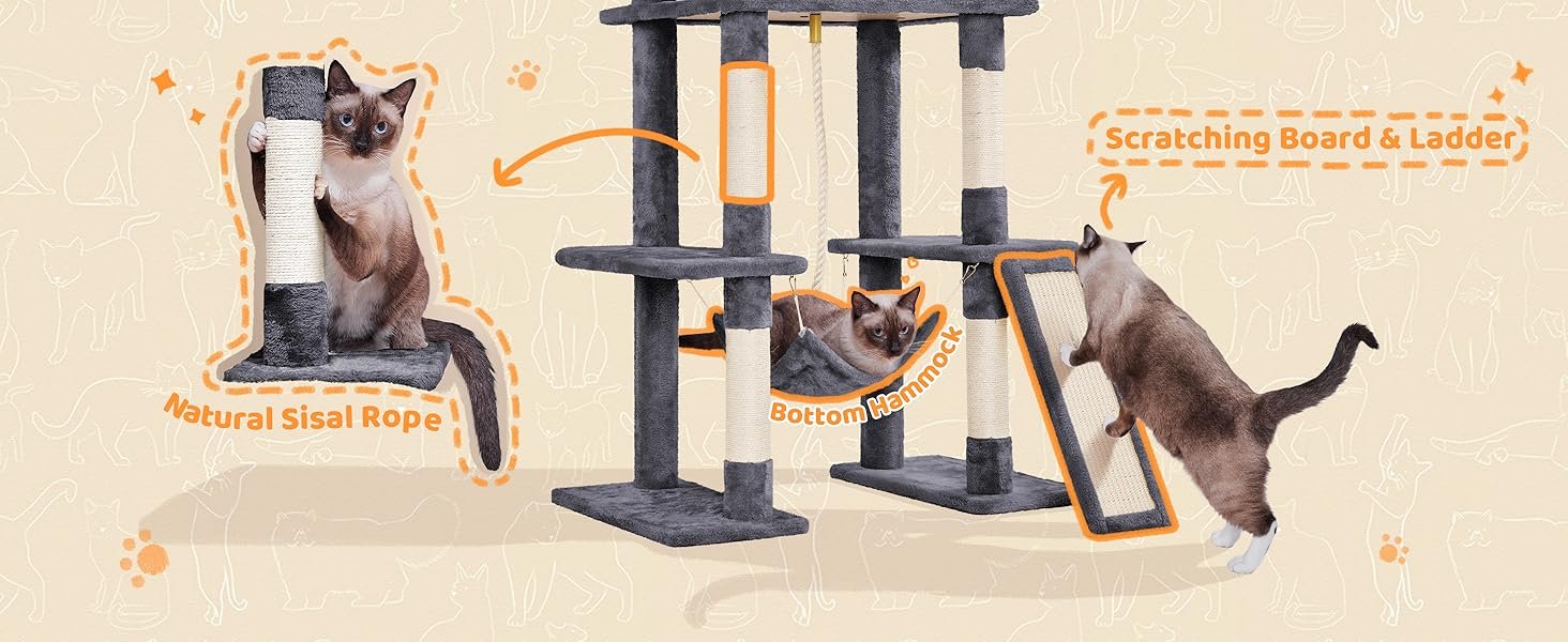 INTERESTING LAYOUTS: Ample room and reasonable layout ensure your cat a comfortable and interesting experience. Your cute cat can hide in the condo, sleep on the lower hammock, and enjoy the scenery on the top perch. The scratching posts, a ladder, a hanging ball, and rope will bring him/her more fun
