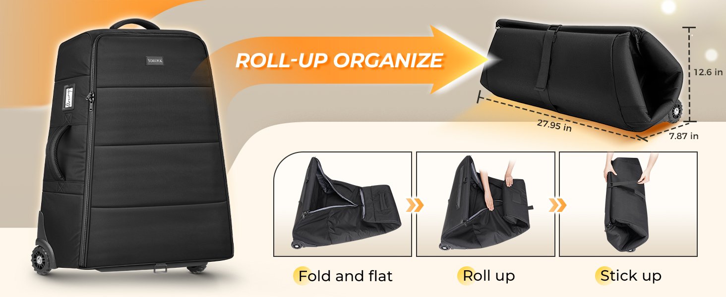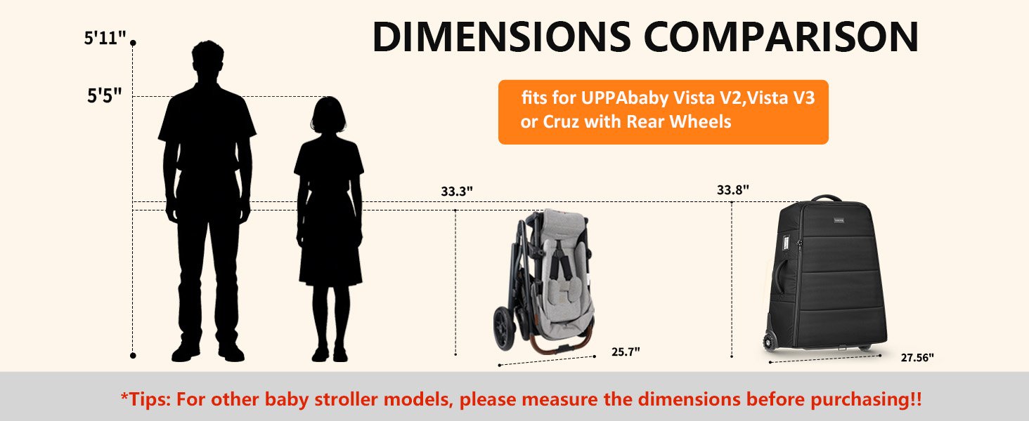 Compatibility: Fits for UPPAbaby VISTA V1/V2/V3 & CRUZ V2 strollers. Designed for hassle-free travel–no wheel removal required. Simply detach the stroller bar and place it inside. Please note: The stroller bag measures 27.56 inches in width, which exceeds standard security checkpoint requirements and cannot be used for carry-on; it must be checked as baggage