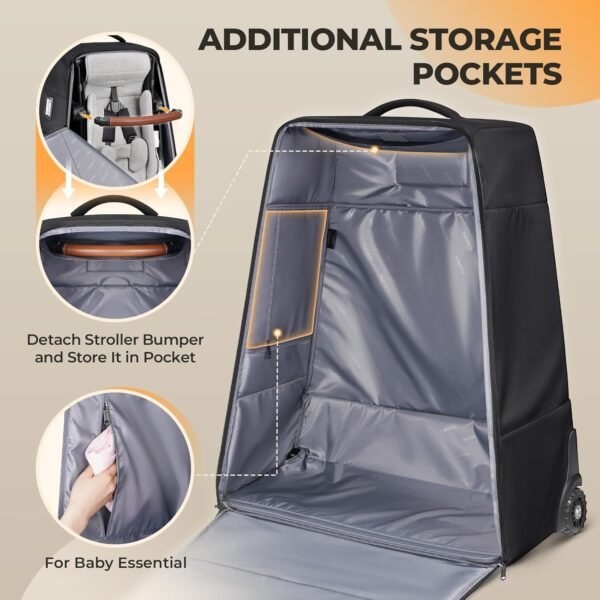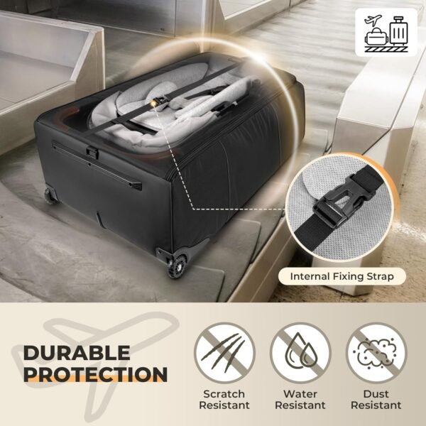All-around Protection: The sturdy stroller cover for airplane travel is made of 3 layers of premium materials: an outer layer, a thick EPE layer, and a high-density inner lining. It features an interior fixing strap to minimize damage from shaking during transit. The bottom of large stroller bag is made of scratch-resistant leather to reduce damage on rough ground