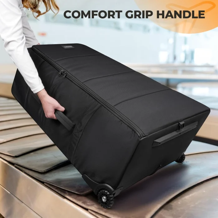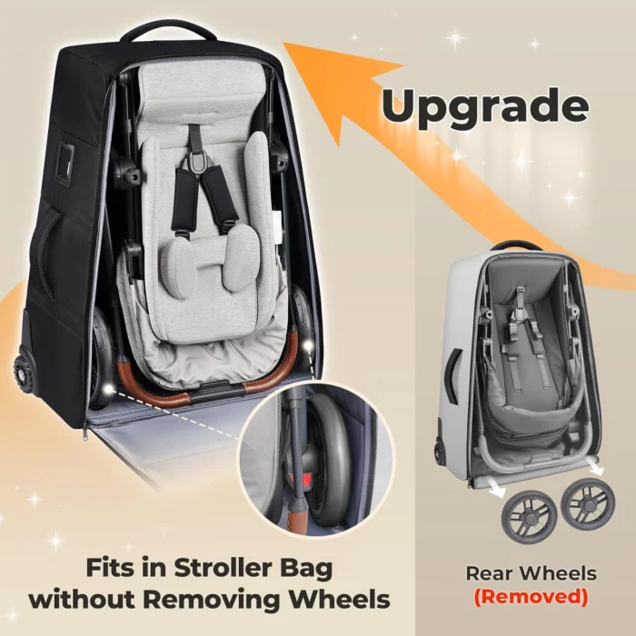 Keep baby stroller protected during flights with this stroller travel bag with wheels, shielding against scratches, conveyor belt grime, and cabin dust to maintain cleanliness and longevity.
