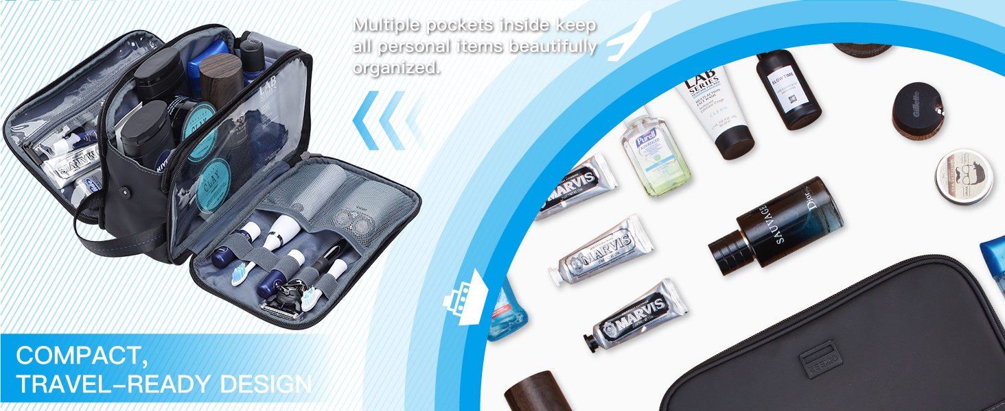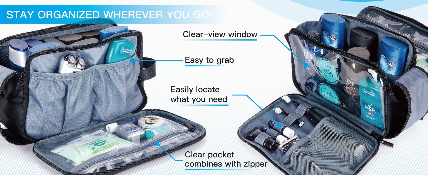 DOUBLE SIDE FULL OPEN DESIGN: 2 side compartments can be laid flat, no need to open the main compartment to search. Use the elastic band, mesh pockets and pouches to sort your tooth brushes, razors, electric trimmer or other small items